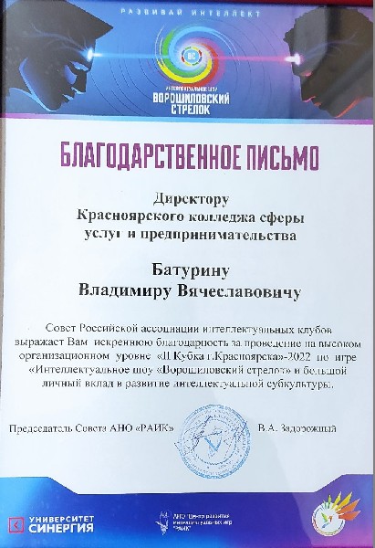 Совет Российской ассоциации интеллектуальных клубов также выразил искреннюю благодарность директору колледжа Владимиру Вячеславовичу Батурину за проведение на высоком организационном уровне II Кубка г. Красноярска-2022 по игре «Интеллектуальное шоу «Ворошиловский стрелок» и большой личный вклад в развитие интеллектуальной субкультуры.