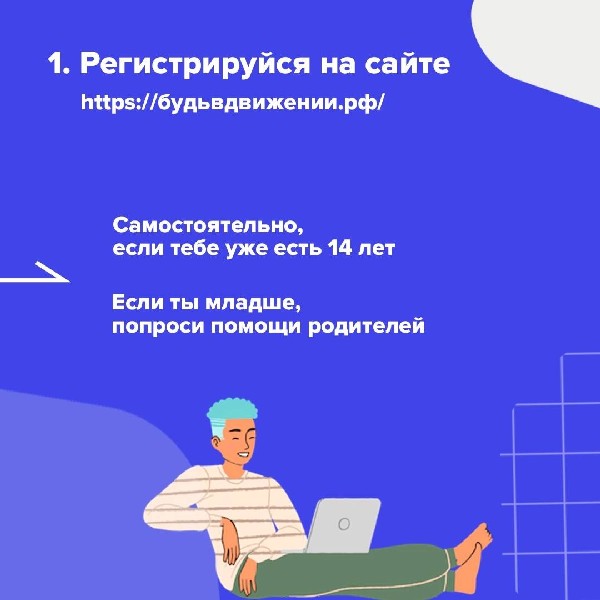 Регистрируйся сам на сайте https://будьвдвижении.рф/, если тебе есть 14 лет, или попроси родителей, если младше.