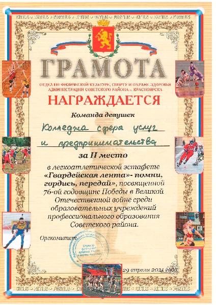 29 апреля женская сборная колледжа заняла II место на легкоатлетической эстафете «Гвардейская лента» – помни, гордись, передай», посвященной 76-ой годовщине Победы в Великой Отечественной войне, среди образовательных учреждений профессионального образования Советского района.