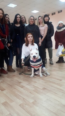 На встрече так же присутствовала волонтер-кинолог Валерия и ее стаффордширский терьер по кличе Стич, который вызвал умиление и бурный интерес у студентов. Валерия рассказывала о психологии собак и об опыте работы с ними.