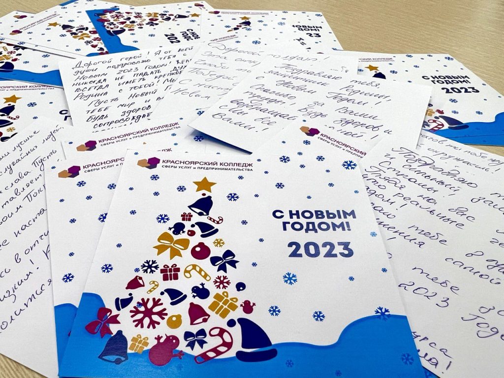 В преддверии Нового года студенты Красноярского колледжа сферы услуг и предпринимательства в рамках Общероссийской акции взаимопомощи #МЫВМЕСТЕ написали открытки, чтобы подарить новогодние поздравления военнослужащим, защищающим Родину.