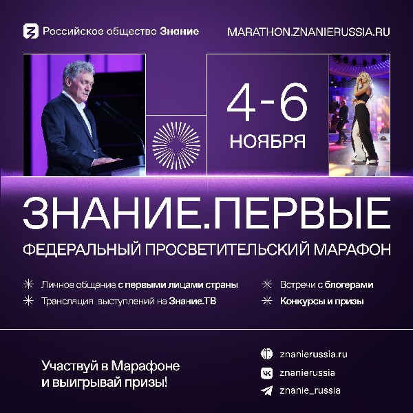 Российское общество «Знание» подготовило для тебя самый масштабный просветительский Марафон Знание.Первые, который стартует в день открытия Международной выставки-форума «Россия» и пройдет с 4 по 6 ноября на ВДНХ в Москве.