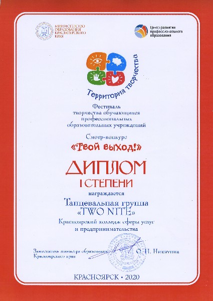 • обладателей дипломов Iстепени смотра-конкурса «Твой выход» – танцевальный коллектив 2Nite и вокальный дуэт педагогов колледжа Черницкого Игоря Витальевича и Якименко Валерии Евгеньевны;