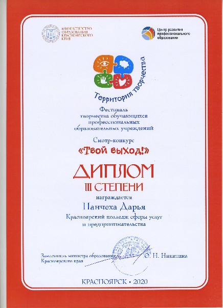 • Панчеху Дарью дипломантку IIIстепени смотра-конкурса «Твой выход» в номинации «Вокал»!