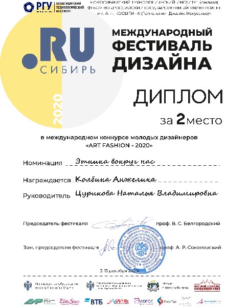 Участниками международного конкурса Международный конкурс молодых дизайнеров «Art Fashion» стали наши студентки Анжелика Колбина (группа 4-7) и Марианна Цурикова (группа ДЗО19-9Б). Обе стали финалистками конкурса. В номинации «Этника вокруг нас» работа Анжелики заняла второе место. Приятно отметить, что первое место заняла коллекция из Москвы, второе – Красноярск, а третье – Омская школа дизайна. Это очень достойный результат!
