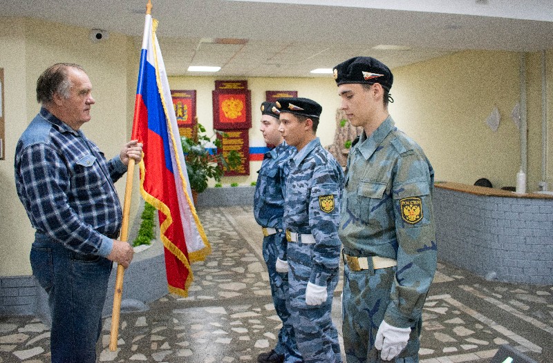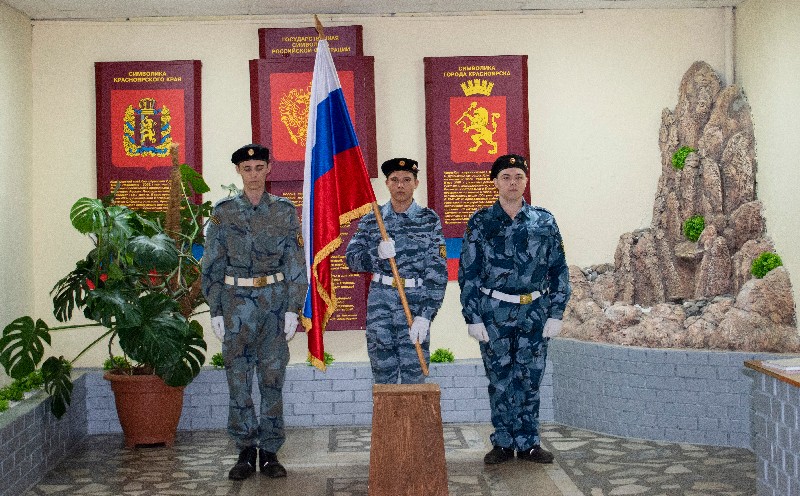 Под руководством Владимира Петровича Граборова, флаг спускали члены военно-патриотического клуба, участники и призёры военно-спортивной игры «Патриот» и Спартакиады допризывной молодёжи Советского района города Красноярска.