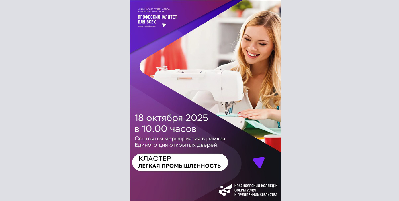 В этот день вы сможете погрузиться в мир профессий легкой промышленности Красноярского края! Мы предлагаем вам возможность попробовать себя в различных специальностях: от дизайнера одежды до конструктора-технолога и мастера по изготовлению швейных изделий.