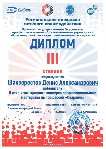 24-25 сентября на базе Региональной площадки сетевого взаимодействия (Красноярский техникум промышленного сервиса) прошел II открытый краевой конкурс профессионального мастерства по профессии «Сварщик» среди студентов профессиональных образовательных организаций. Двадцать четыре конкурсанта выполняли практическое задание – изготовление герметичной ёмкости ручной дуговой сваркой. Жюри, представители официальных партнеров конкурса, специалисты Красноярского регионального отделения ООО «Союз машиностроителей России» и ООО «ИТС-Сибирь», отметили высокий уровень мастерства будущих сварщиков. Студентов нашего колледжа, осваивающих профессию, которая входит в список ТОП-50 самых востребованных профессий по версии Минтруда РФ, на конкурсе представлял студент группы III-19 Денис Шахворостов. Денис уже имеет успешный опыт участия в конкурсах и чемпионатах профессионального мастерства, и сегодня он занял III место! Поздравляем с успешным началом подготовки к участию в чемпионатном цикле движения «Молодые профессионалы» (WorldSkills Russia)!