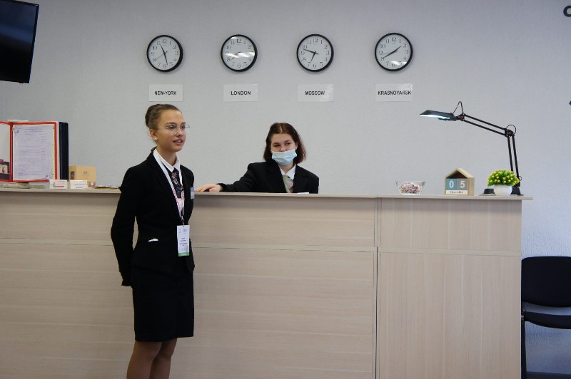 2) выполнение интерактивного модуля за стойкой ресепшен: заселение гостя, бронирование номера, решение конфликтной ситуации и предоставление туристической информации (50% заданий выполняется на английском языке).